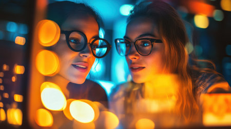 Two women sit closely together, engaged in an intimate conversation in a cafe filled with warm, glowing lights, creating a cozy atmosphere during the evening.