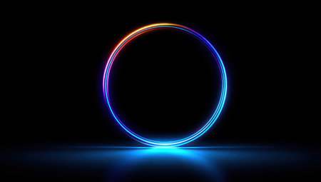 A neon ring with a vibrant rainbow gradient shines brightly, reflecting on a dark, polished surface in this abstract composition.