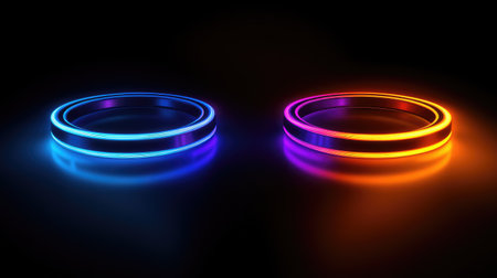 Two intersecting neon rings glow against a dark backdrop. The rings display a gradient of vivid colors, including blue, pink, and orange. The composition suggests an interplay of light and shadow, with a focus on geometric shapes. Suitable for graphic design and digital art projects, the image has potential commercial applications.
