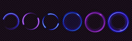 Glow circles with sparkles, magic light effect. Vector realistic set of blue and purple shiny rings and swirls, round frames of flare trail with glitter dust isolated on transparent background