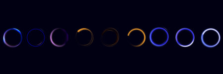 An artistic composition showcases a collection of illuminated rings, each displaying a unique color. The rings are arranged in a row against a dark background, creating a sense of depth and contrast. The image uses vibrant colors and highlights, which makes it suitable for promotional material or creative projects.