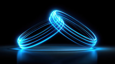 Blue glowing rings with light trails intersecting on a dark background, representing unity, connection, and abstract design concepts for digital art