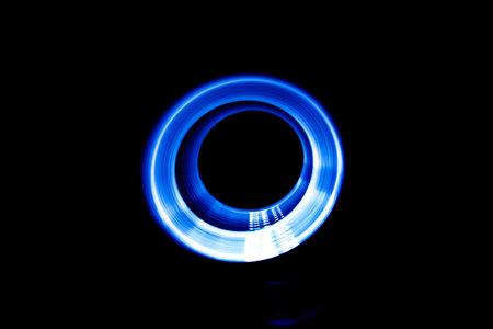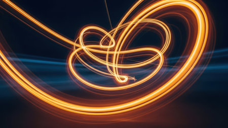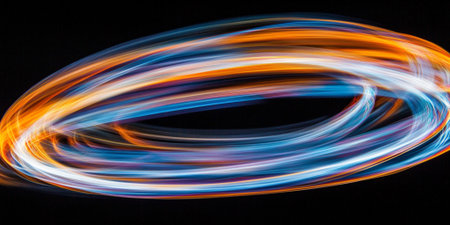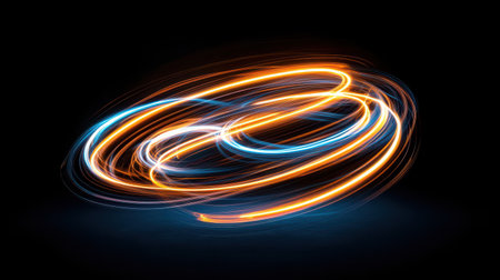 A stunning visual representation of energy and movement, showcasing glowing orange light trails creating dynamic circular shapes against a rich black background.