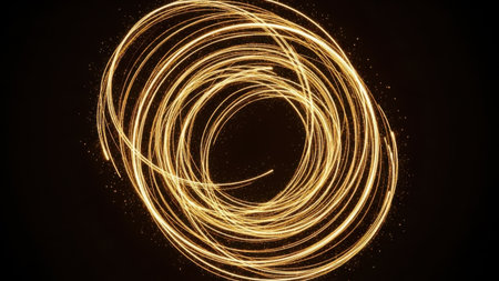 A captivating abstract image showcasing dynamic circular motion with vibrant golden light trails against a dark background, conveying energy and creativity.