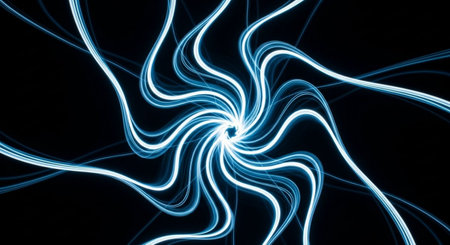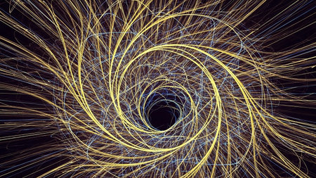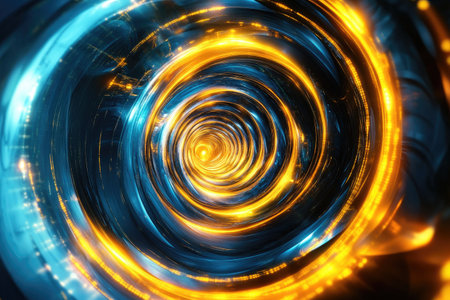 A dynamic abstract a swirling vortex of bright golden and blue light trails against a dark background, creating a sense of rapid motion and energy.