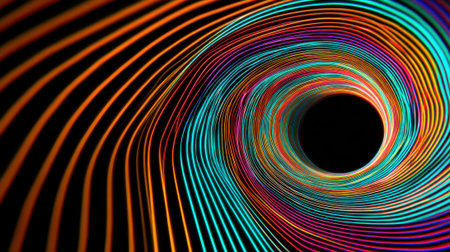A spiral design made of bright lines travels inward toward a black center. The colors include orange blue purple and green in a flowing pattern. The design gives a sense of movement and depth.