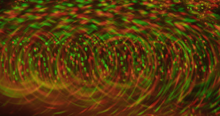 Light sparkles. Defocused beam. Yellow green red colorful particles bokeh gleaming flickers moving on blurred abstract background.