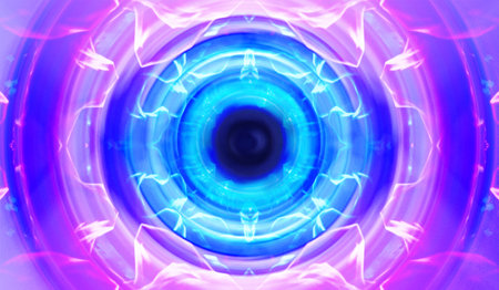 Vibrant abstract swirl of neon blue, pink, and turquoise lines creating a hypnotic circular motion effect.