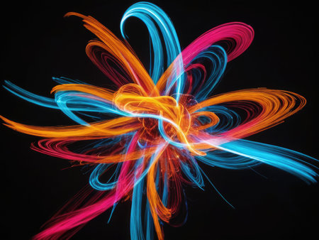 Dynamic swirls of glowing lines in orange and blue hues against a dark background, creating an abstract, vibrant energy pattern for creative projects