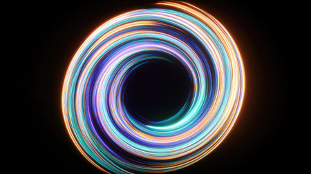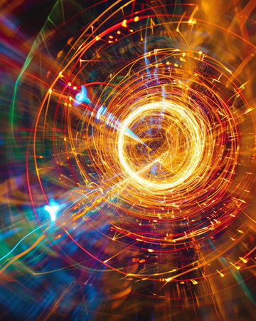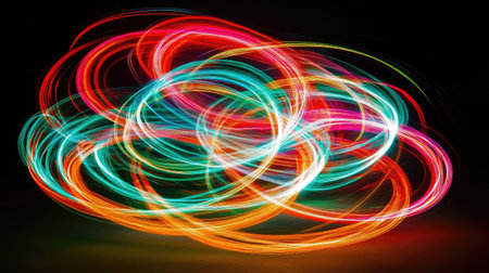 A mesmerizing swirl of vibrant light trails in circular motion, creating an abstract visual feast. Ideal for projects seeking a dynamic and colorful touch.