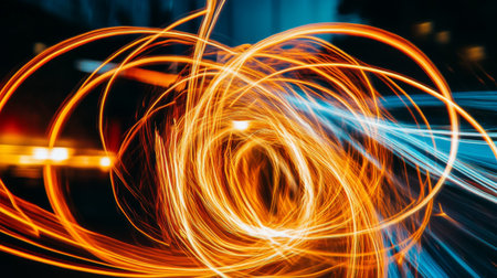 This image captures the mesmerizing effect of light trails swirling in the night sky. The bright orange and yellow streaks create intricate patterns against the dark background, suggesting motion and energy. The light trails appear to dance and intertwine, creating a sense of dynamic movement and fluidity. This photograph is likely taken using a long exposure technique, which allows the light to be captured as continuous, flowing lines. The overall composition evokes a sense of wonder and the beauty of natural and artificial light interactions.