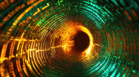 A bright neon light tunnel with overlapping lines in green and gold, glowing vividly on a black backdrop