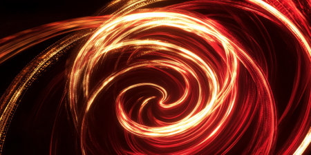 Bold streaks of red and gold light trails spiraling upward, creating a vibrant vortex of motion on a black background.