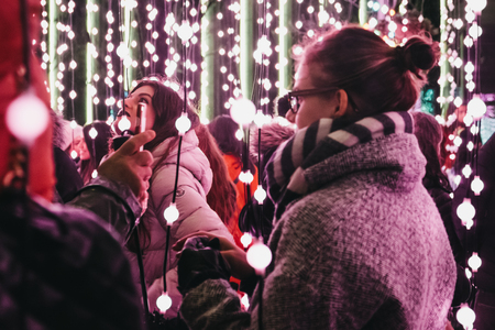 London, UK - January 26, 2019: People walking inside Winter Lights, yearly lights and installations festival in Canary Wharf. Canary Wharf is a busy financial area of London that often host events.