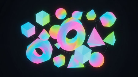 An assortment of 3D geometric shapes and solids, including cubes, spheres, and pyramids, are illuminated with neon rainbow colors against a dark background.
