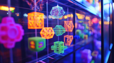 Colorful geometric shapes create a captivating visual display, highlighting intricate patterns in a dark environment with vibrant neon lighting.
