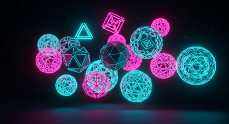 A diverse collection of geometric shapes, including spheres, polyhedrons, and a triangle, are illuminated with striking neon pink and cyan lights. These forms are suspended in a dark, minimalist environment, creating a visually arresting abstract composition. The sharp, defined edges of the shapes are emphasized by the glowing outlines, giving them a crystalline or digital appearance. The interplay of light and shadow adds depth and dimension to the scene.