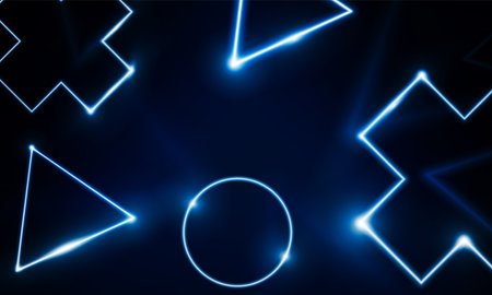 A striking display of glowing geometric shapes—diamonds, circles, and triangles—illuminates a sleek, dark backdrop. The vibrant neon blue light creates a modern and futuristic vibe, inviting viewers to explore the beauty of simplicity and design.