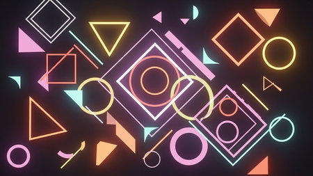 A collection of colorful geometric shapes including squares, circles, and triangles with a vibrant neon glow are arranged abstractly on a dark background.
