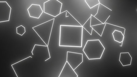 Various neon geometric shapes like squares, hexagons, and triangles with glowing white outlines float randomly against a dark background.