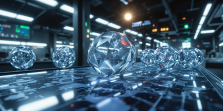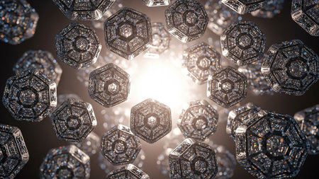 A cluster of geometric, crystal-like structures with sparkling facets and a bright central glow.