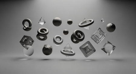 A variety of 3D geometric shapes in different materials and forms float in a studio.