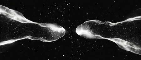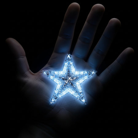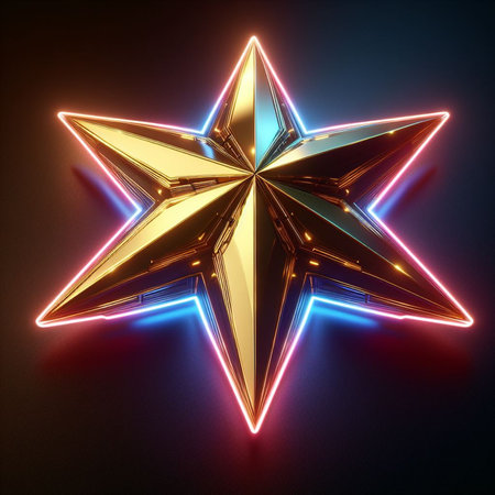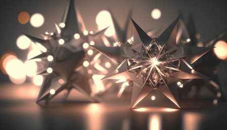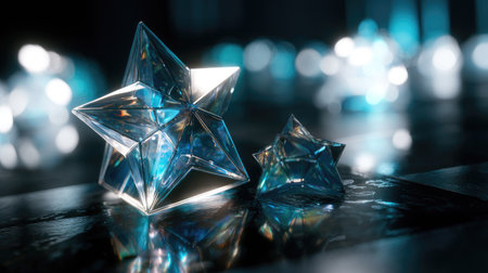 Two crystalline star sculptures are displayed on a dark, reflective surface. The artwork showcases intricate facets and a cool color palette with shades of blue and silver. The lighting creates a dynamic play of light and shadow. Suitable for commercial projects or editorial use.