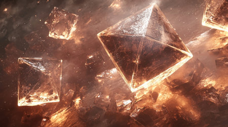 Captivating macro shot of ice crystals glimmering with a warm orange glow, showcasing intricate textures and unique shapes for a stunning visual impact.