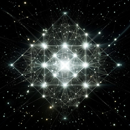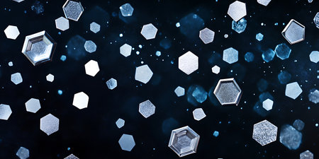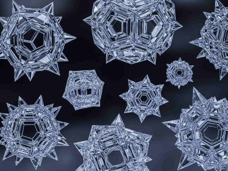 Delicate snowflake-like geometric shapes shine softly, creating a captivating visual effect against a dark background.
