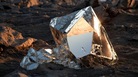 Geometric reflective sculpture on rocky terrain at sunset, abstract art concept