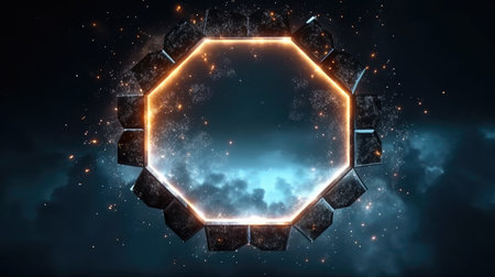Glowing hexagonal frame in the clouds. Digital art with fiery effect and dark sky. Sci-fi and fantasy concept. Futuristic portal in hexagon shape surrounded with smoke. Design for wallpaper. AIG35.