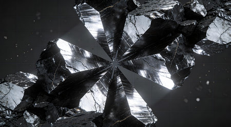 A creative digital illustration depicting Elegant commercial digital art of hematite metallic ore texture with specular reflections, crystalline chunks composition, cool metallic lighting, geometric industrial luxury, iron black sheen. This AI-generated artwork features unique visual elements suitable for various commercial and editorial applications. AI-generated illustration.