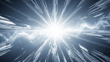 An abstract depiction of a cosmic explosion of bright light and sharp geometric shapes against a deep space background with stars and nebulae.
