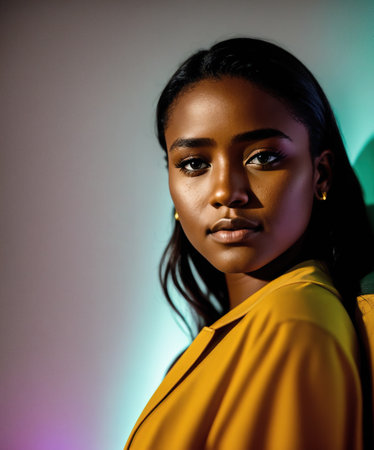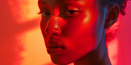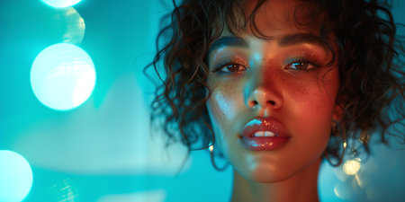 A close-up portrait of a young woman in dramatic, colorful lighting, highlighting her facial features and symbolizing individuality and modern style.