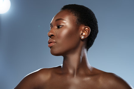 Closeup portrait of a beautiful African woman with dark skin and brown eyes on a neutral background