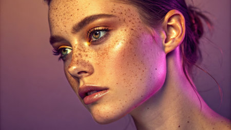 With a bold gaze the subjects freckled face shines brilliantly under gentle lighting. Neon shadows in warm metallic gold and cool violet create a stunning backdrop that enhances.