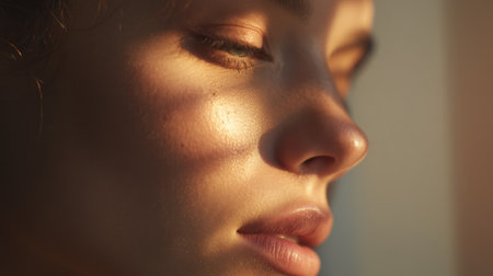A serene close-up portrait capturing the beauty of a woman's face illuminated by soft sunlight, creating gentle shadows that enhance her natural features and evoke tranquility.