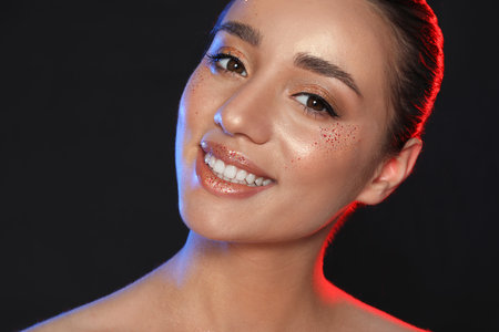 Young woman with glitter on her face against color background. Beauty, cosmetics and creative art makeup. Bright skin.