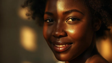 Close up portrait of young woman with glowing skin, showcasing natural beauty and soft features. lighting highlights her cheekbones and creates warm, inviting atmosphere