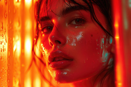 A striking portrait of a woman with glowing skin, illuminated by vibrant lighting, highlighting her features and the moisture on her face.