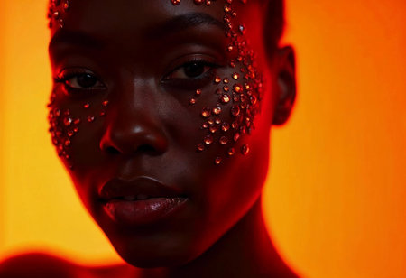In a captivating display, a model poses confidently with sparkling gems adorning her face, creating a stunning contrast against a warm orange backdrop.