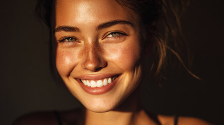 A stunning close-up portrait featuring a young woman with a radiant smile and captivating eyes. Warm ambient light enhances her natural beauty and joyful expression.