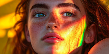 Close-up Of Young Woman Face With Sun Shine And Colorful Reflection, Freckles Beauty.