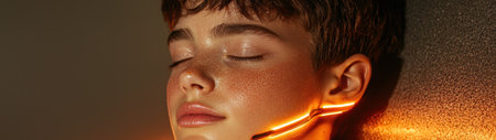 Woman's face with futuristic neon lighting, eyes closed, glowing skin