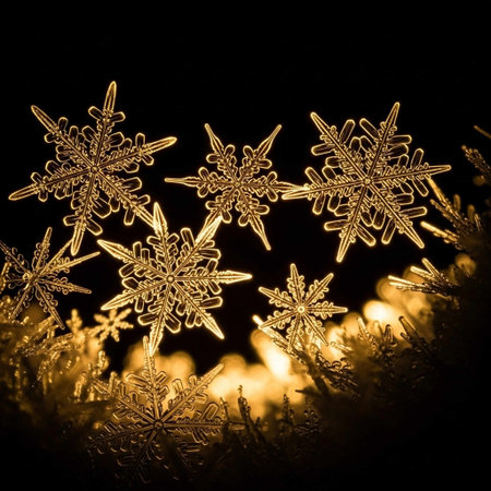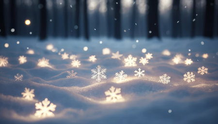 A serene winter scene featuring delicate snowflakes adorned with warm lights, creating a cozy atmosphere with gently falling snow, perfect for holiday themes.