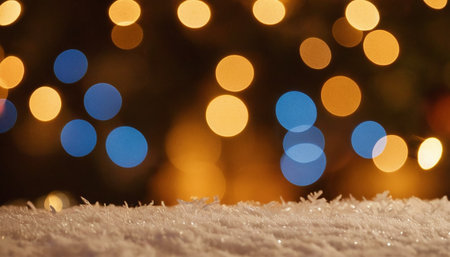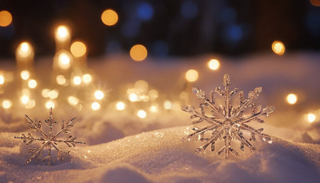 Bokeh lights resembling snowflakes illuminate the dark background, creating a warm and festive ambiance ideal for winter celebrations and holiday decorations