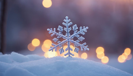 A serene winter landscape featuring a delicate snowflake resting on soft snow, complemented by a beautiful bokeh lighting effect in blue and white.