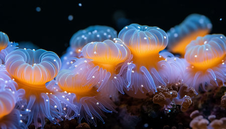 coral polyps with glowing colors during nighttime feed, created with generative ai