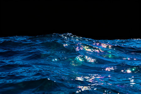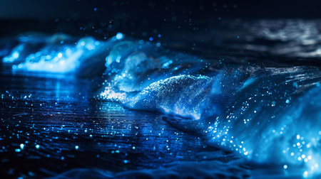Dark blue waves are illuminated by glowing particles, creating a stunning visual effect at night.