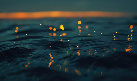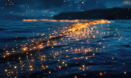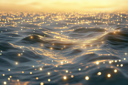 Shimmering light dances on calm seawater, highlighting luminous droplets that glisten like tiny treasures amidst soft, rolling waves in a tranquil seascape.